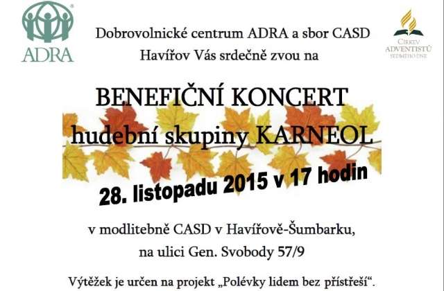 Srdečně Vás všechny zveme na Benefiční koncert, který se bude konat v sobotu 28. listopadu 2015 od 17 hodin v modlitebně Církve adventistů sedmého dne v Havířově – Šumbarku na ul. Gen. Svobody 57/9. Sobotním podvečerem nás bude provázet hudební skupina Karneol.