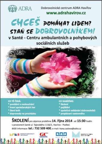 Srdečně zveme všechny zájemce o dobrovolnictví na školení, které se bude konat v úterý 14.10. v 15:30 v Santé na ul. Tajovského 1156/1, v Havířově - Podlesí. Stačí jen hodina Vašeho času týdně a můžete potěšit ty, kteří Vaši přítomnost potřebují, a velmi se z ní pak radují! :-)