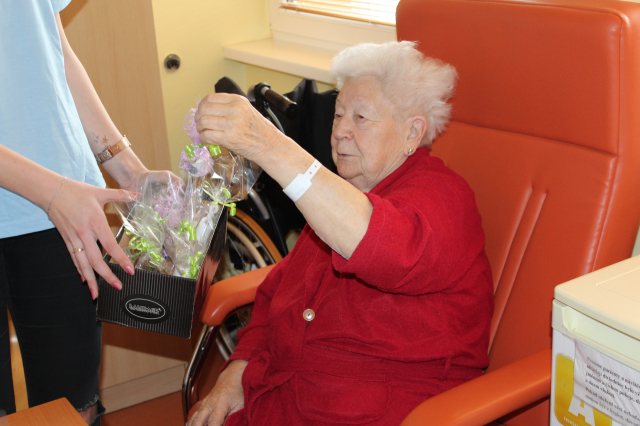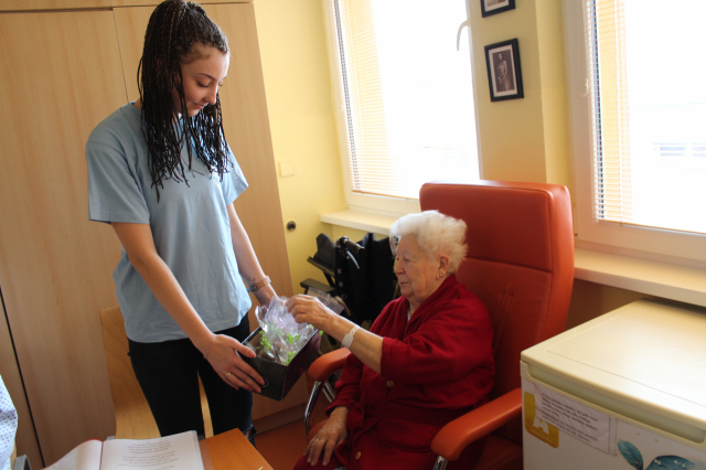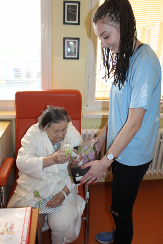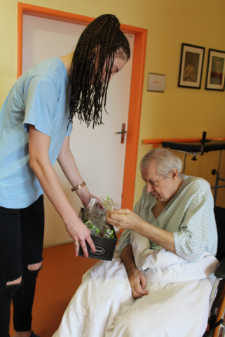 Spolu s šesti pacienty jsme si zazpívali převážně lidové písně, senioři také vzpomínali na své písně z mládí, pátrali v paměti a velmi nás překvapili, na kolik slok si vzpomněli :-) Program jsme zpestřily hádáním známých osobností a na závěr dobrovolnice Izabelka zahrála nádhernou skladbu z pohádky Radúz a Mahulena. Jedna pacientka z pokoje č. 1 bohužel nemohla vůbec vstát z postele, tak nás aspoň poslouchala a právě při poslední písni bylo vidět, jak se jí to líbí, smála se a mávala na nás. Houslistka poté přišla k ní na pokoj, popovídaly si a dobrovolnice paní dala malý dáreček - zvoneček. Několik dalších jsme pak rozdaly i ostatním pacientům, aby měli na toto setkání malou památku. Byl to nádherně strávený čas a my se těšíme, až za pacienty přijdeme zas :-)
