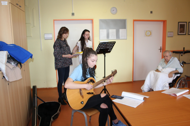 Jedna dobrovolnice se zlatem v hrdle, druhá s houslemi a třetí s kytarou v ruce opět potěšily pacienty na oddělení LDN v havířovské nemocnici. Někteří pacienti už s námi zpívali i v březnu, tak se na zpívánky těšili. Někteří přicházeli s rozpaky a nevěděli, co se vlastně bude dít. "To jako budeme zpívat?", ptal se jeden přicházející pán. "Ano, zpívat, notovat, pobrukovat nebo jen tak poslouchat..., " řekla koordinátorka Jana Žoričová.