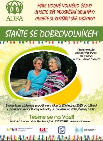 Hledáme dobrovolníky pro seniory do nově otevřeného Domova seniorů Senior domy Pohoda v Českém Těšíně. Máte-li volný čas, chtěli byste ho strávit smysluplně a pomáhat druhým? Staňte se dobrovolníkem u seniorů v Českém Těšíně! Školení se bude konat v úterý 17.března v 16hod. v Senior domu Pohoda na ul. Svojsíkova 2087 v Českém Těšíně.