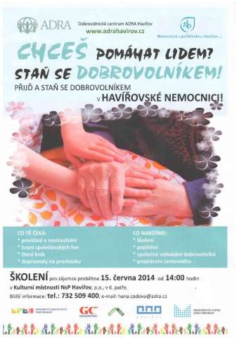 V Havířově se nyní aktivně zapojuje do dobrovolnických programů přes 100 dobrovolníků. Přidejte se k dobrovolníkům v havířovské nemocnici, kde tento program funguje již tři roky. Dobrovolníci si s pacienty povídají, čtou knihy, hrají hry, popř. chodí na procházky a vyplňují tak jejich volný čas. Jedna hodina týdně může přinést tolik radosti nemocným lidem!