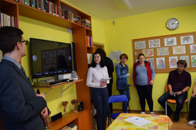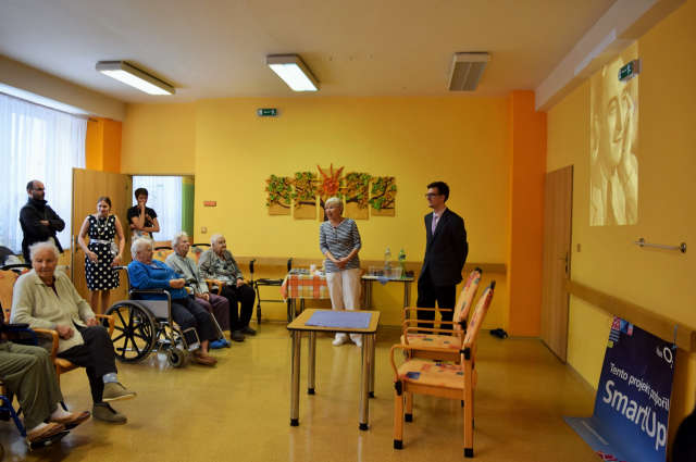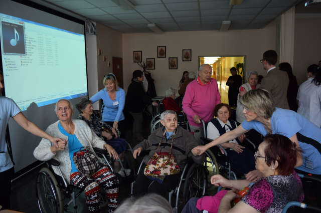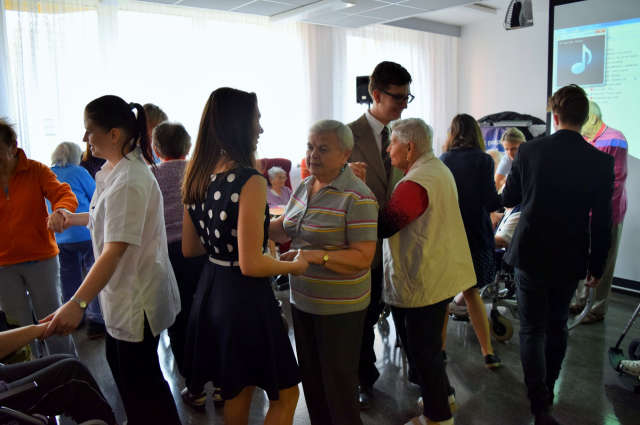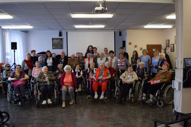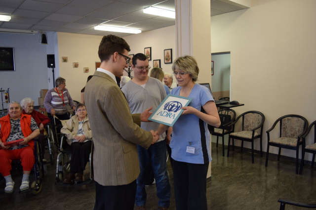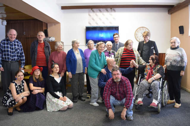 Druhou naší zastávkou byl havířovský domov pro seniory Luna. Do útulné knihovny se za námi přišlo podívat hodně diváků. Senioři byli tak aktivní, že se při hraní scének z filmů doslova překřikovali jeden přes druhého, abychom věděli, že Kristiána či Pyšnou princeznu opravdu poznali. Tento zájem a znalosti nás mile potěšily, ale herci se museli o to více soustředit na nevýpadek textu. :-) Hádání fotek proběhlo také velmi hladce. Při závěrečném tanci, řečeno ekonomicky, poptávka výrazně převyšovala nabídku, na taneční parket se bohužel nevešli všichni, kteří měli zájem. Aktivizační pracovnice nám pomohly roztancovat i dámy na vozíčcích. Závěrečné společné foto prozatím patří k těm největším. Fotoaparát měl veliký problém nás všechny zabrat. Nakonec nám paní Miladka Kubová, aktivizační pracovnice, předala velice milou pozornost - obrázek s logem ADRY vytvořený spolu s uživatelkami tvořivých dílen.