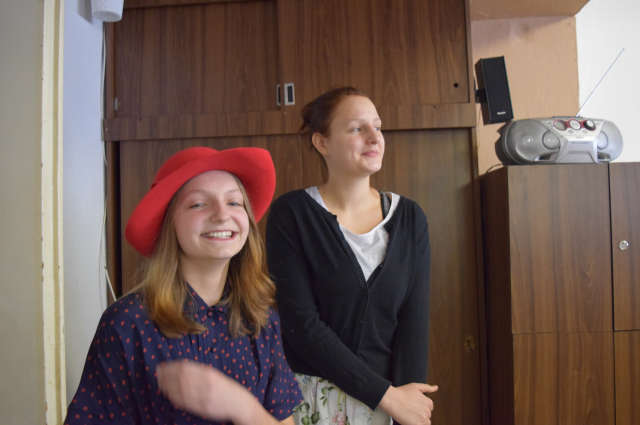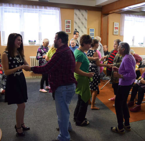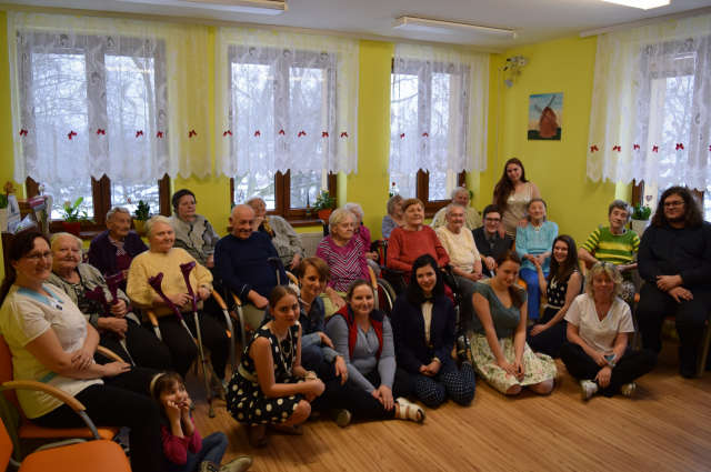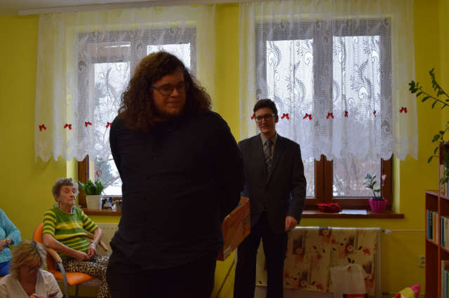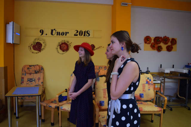 V domově pro seniory Petřvald Březiny na nás bylo publikum připraveno více, než jsme očekávali. Teprve jsme se převlékali do retro kostýmu, chystali techniku, ale senioři už pozorně seděli v hledišti. Tím, že většina z nás měla jarní prázdniny, přijeli jsme už dopoledne. Dopolední program měl své kouzlo. Čerstvě odpočatí uživatelé byli vnímavější, jedna z divaček nás dokonce naváděla, jak správně máme držet mikrofon u pusy a i pro nás to bylo hezké zahájení dne.