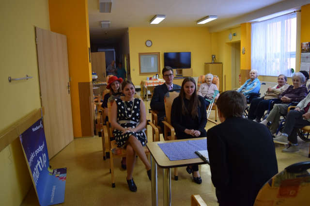 Den nato jsme se zajeli podívat do domova Pohoda v Orlové, kde nás přivítala paní Třasková, velice hodná paní aktivizační pracovnice, která nám po celou dobu pomáhala komunikovat se seniorkami, protože je samozřejmě zná lépe než my. Ano, v publiku byly tentokrát pouze ženy a celý program se odehrával ve velice komorním prostředí. Akorát nás zradila technika. Kvůli absenci silných reprobeden se nám nepodařilo pouštět písničky dostatečně nahlas a nakonec se vybil i samotný notebook, takže jsme museli začít improvizovat. Maty neváhal a se situací si poradil. Navrhnul, že si všichni sedneme mezi seniory do kolečka a společně si popovídáme. Bylo to velice netradiční, ale o to příjemnější zakončení tohoto odpoledne. Moc děkujeme paní Třaskové, že se nám tak ochotně věnovala.