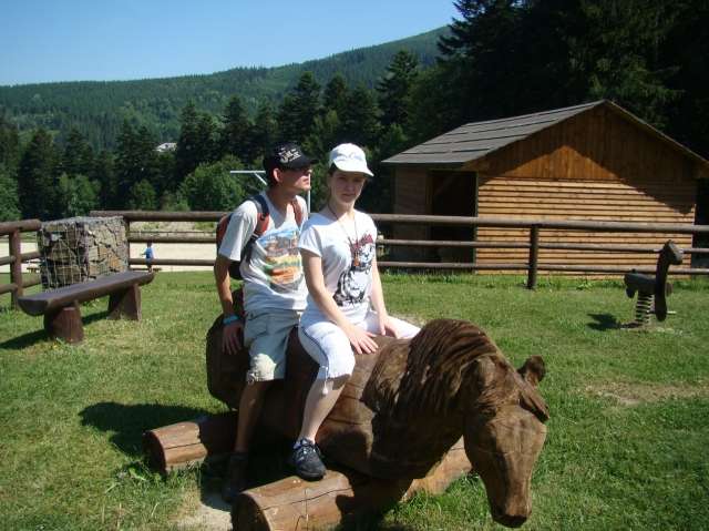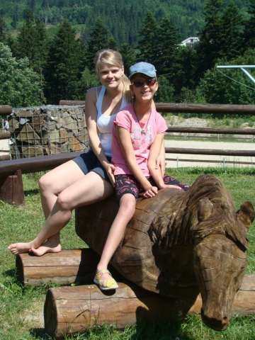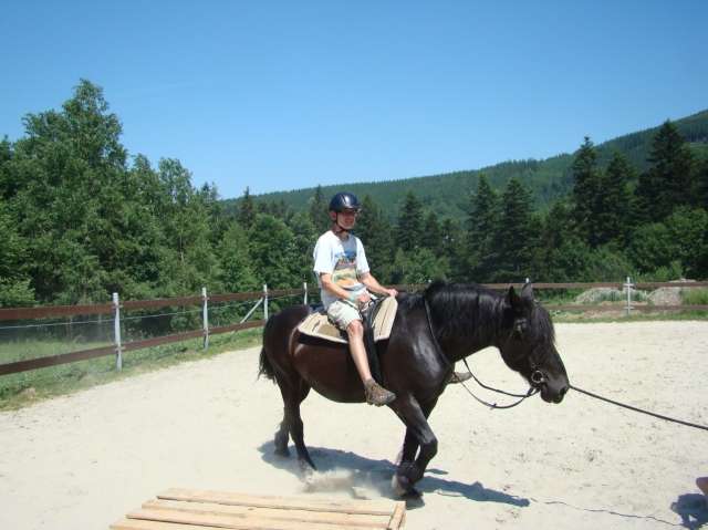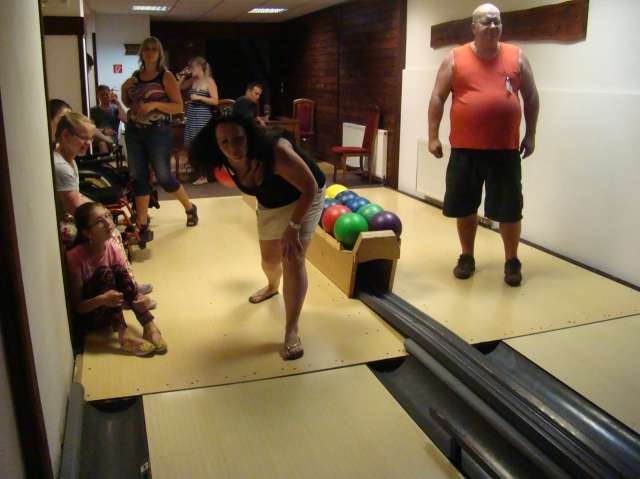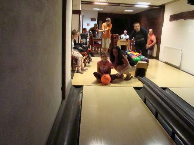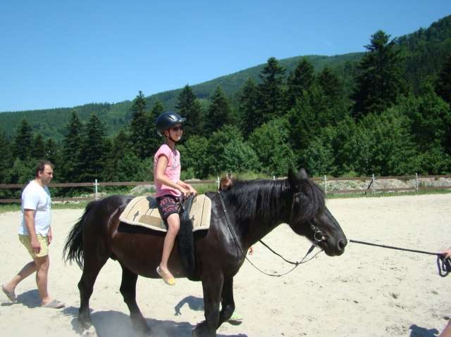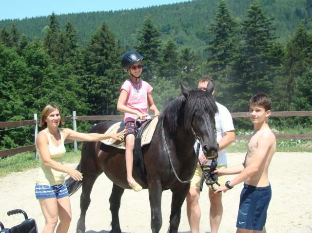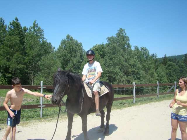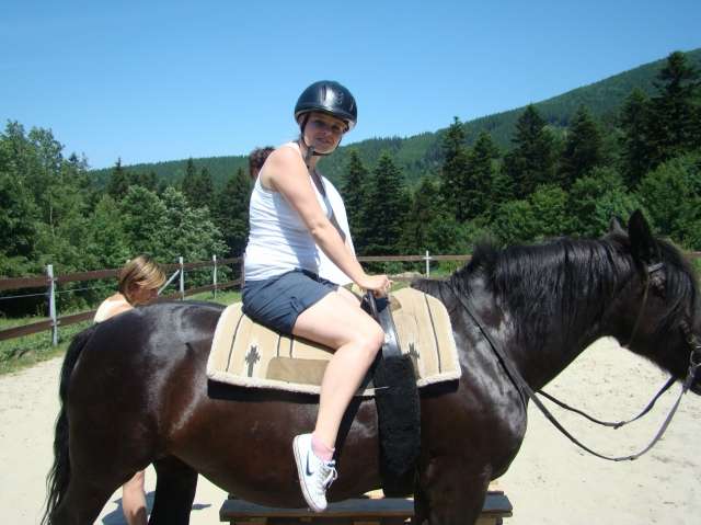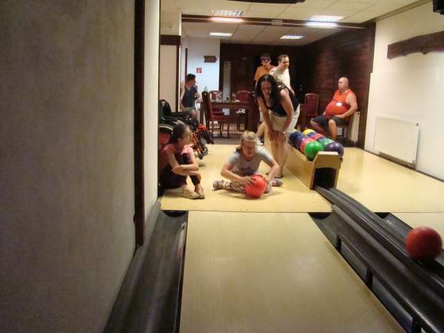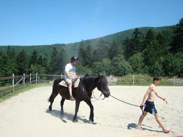 V sobotu ráno po snídani jsme pěšky vyrazili do místních kopců směr koňský ranč, kde jsme měli domluvené projížďky na koních. Na ranč jsme přišli včas, personál již na nás čekal a všichni jsme se mohli projet na koních, což byl pro nás všechny úžasný zážitek. V jízdárně jsme si pochutnali na výborném obědě, poté jsme šli dolů k hotelu. Odpoledne jsme strávili na louce u hotelu, kde jsme společně hráli různé hry – házeli jsme létajícím talířem, hráli si s balónem, stříleli s lukem apod. Po večeři nás čekal bowlingový turnaj, který se všem moc líbil. Sponzorsky nám jej i s občerstvením uhradila Lékárna Harmonie z Havířova – Šumbarku. Večer jsme zakončili taneční zábavou, která byla moc fajn. |