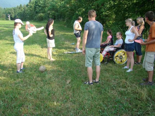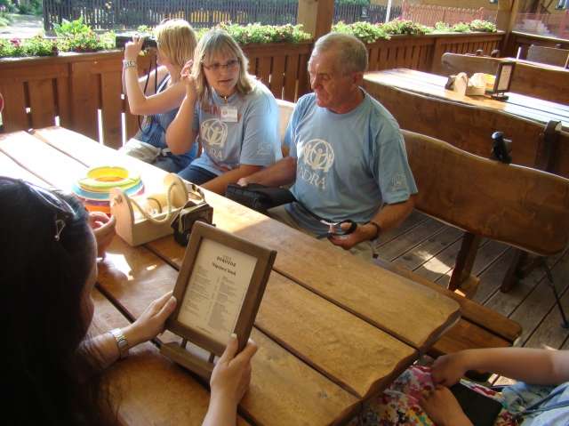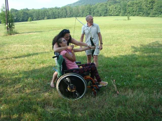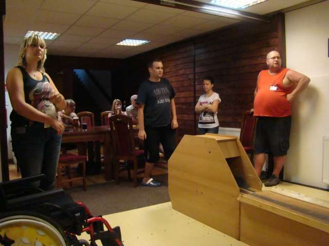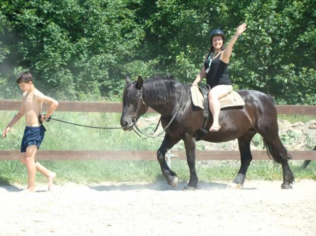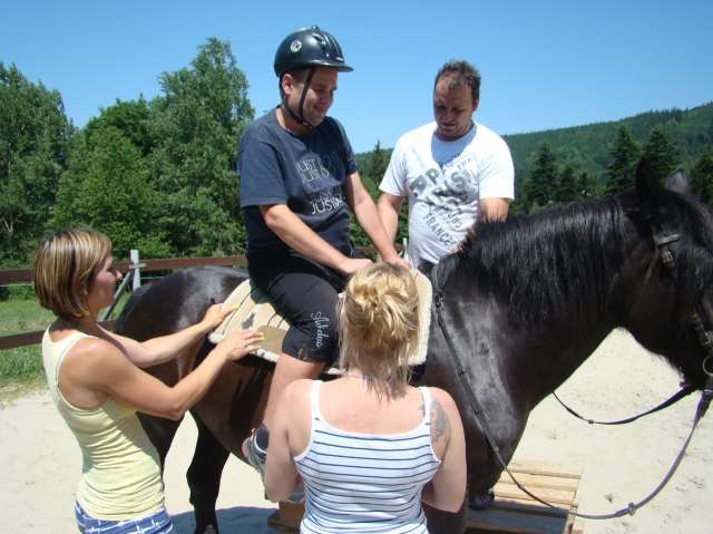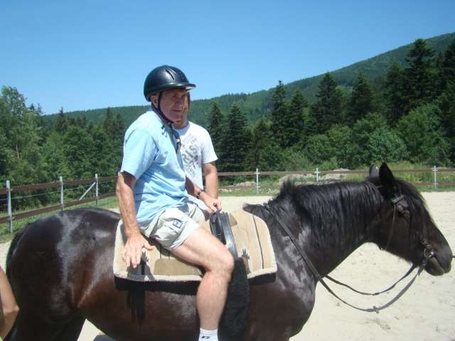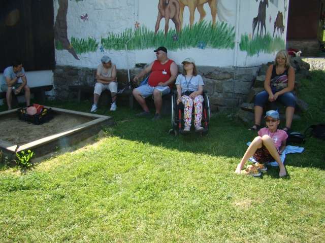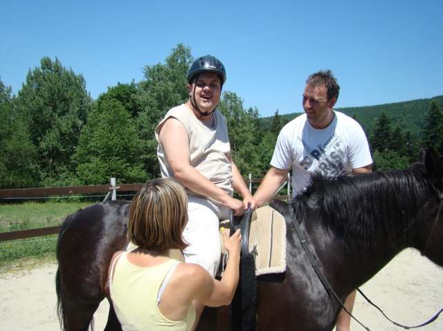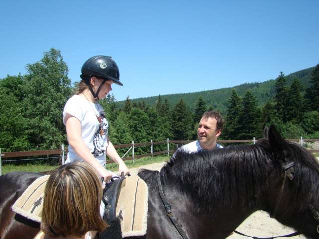 V sobotu ráno po snídani jsme pěšky vyrazili do místních kopců směr koňský ranč, kde jsme měli domluvené projížďky na koních. Na ranč jsme přišli včas, personál již na nás čekal a všichni jsme se mohli projet na koních, což byl pro nás všechny úžasný zážitek. V jízdárně jsme si pochutnali na výborném obědě, poté jsme šli dolů k hotelu. Odpoledne jsme strávili na louce u hotelu, kde jsme společně hráli různé hry – házeli jsme létajícím talířem, hráli si s balónem, stříleli s lukem apod. Po večeři nás čekal bowlingový turnaj, který se všem moc líbil. Sponzorsky nám jej i s občerstvením uhradila Lékárna Harmonie z Havířova – Šumbarku. Večer jsme zakončili taneční zábavou, která byla moc fajn. |