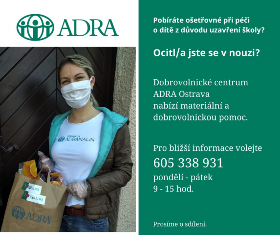 Ve spolupráci s Potravinovou bankou nabízí Dobrovolnické centrum ADRA Ostrava potraviny osobám, které se ocitly v přechodné nouzi, např. pobírají ošetřovné při péči o dítě z důvodu uzavření školy. Osobní vyzvednutí potravin je nutné nejprve telefonicky domluvit na čísle 605 338 931, a to od pondělí do pátku mezi 9 a 15 hodinou. Dobrovolnická pomoc rodinám spočívá v doučování dětí, ideálně on-line, po domluvě i osobně.