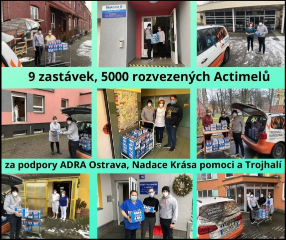 Ve spolupráci tří organizací se k seniorům v ostravských domovech podařilo dostat 5000 ks Acitmelů, které posilují imunitu. Na začátku byla Nadace Krása pomoci Taťány Kuchařové, která oslovila ADRU v Ostravě s nabídkou této pomoci. Protože Dobrovolnické centrum ADRA Ostrava spolupracuje s domovy pro seniory v Ostravě, byla jejich volba jasná. S distribucí Actimelů pomohli zaměstnanci Trojhalí Karolina, kteří je během jednoho dne rozvezli do devíti různých zařízení. Díky vzájemné spolupráci tří subjektů se podařilo alespoň malých dílkem přispět k posílení imunity seniorů v době covidu.