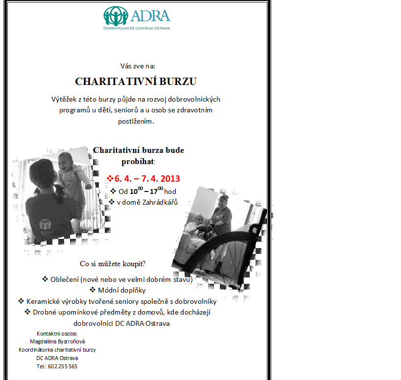 Ve dnech 6. a 7. 4. proběhne ve Vřesině Charitativní burza. Můžete si zde za symbolické ceny nakoupit darované oblečení a podpořit tak rozvoj dobrovolnických programů v Ostravě a blízkém okolí. Burza proběhne v Domě záhradkářů od 10.do 17. hodin