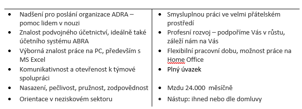 Sedí na Vás naše účetní šibenice? Chcete mít nejen pocit uspokojení a radost z dobře vykonané práce, ale i vědět, že vaše práce má velkou přidanou hodnotu, které říkáme smysl? Chcete se do práce těšit, být součástí skvělé party odborně zdatných lidí a sami odborně i lidsky růst? Nezaleknete se nových výzev? Jste natolik zralou osobností, že dokážete spolupracovat s různými lidmi? Pokud ano, proč to nezkusit v humanitární organizaci ADRA na pozici Účetní - finanční manažer/ka projektů.