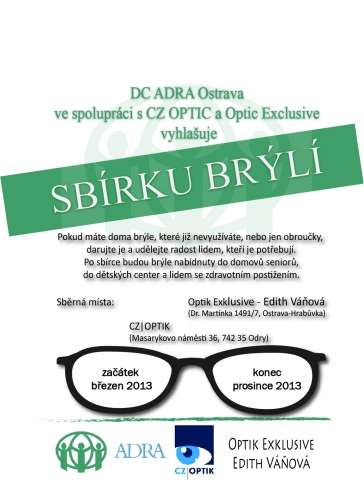 Pokud i Vy chcete darovat staré nebo nepoužívané brýle, můžete je donést na naše sběrná místa - CZ OPTIK a Optik Exkluzive - Edith Váňová.