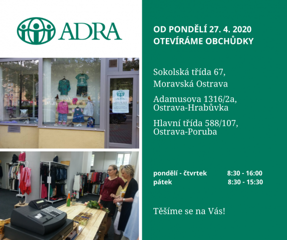 V pondělí 17. 4. 2020 opět otevíráme některé Charitativní obchůdky ADRA v Ostravě