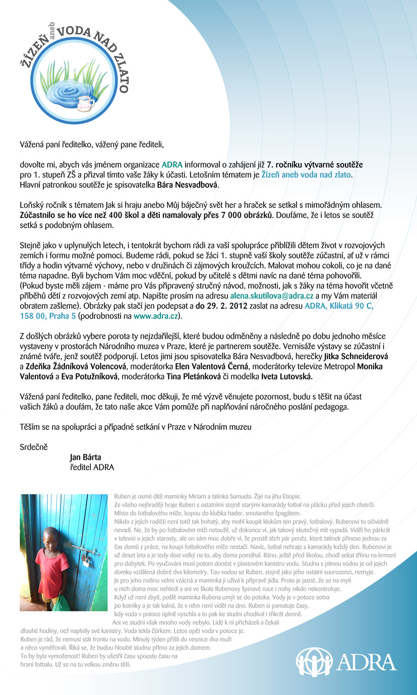 Stejně jako v minulém premiérovém ročníku proběhne v Plzni regionální kolo výtvarné soutěže ADRA. Výtvarné soutěže se mohou účastnit žáci prvního stupně základních škol. Více informací naleznete v materiálech zde: