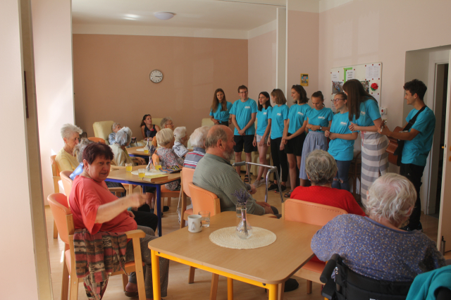 První setkání bylo opatrné, mnozí kluci a slečny se v prostředí domova seniorů ocitli poprvé a necítili se úplně jistě. S postupujícím časem se ale ledy prolomily a při společném zpěvu a povidání se vytvořily moc hezké vztahy. Ač jsme byli "mezinárodní" skupina seskládaná z Čechů i Slováků, všichni jsme našli slipečnou řeč při písničkách bratrů Nedvědů, písniček pánů Svěráka a Uhlíře a samozřejmě nehyběly oblíbené a všem dobře známé písničky Čerešničky, čerešničky, nebo Prší prší v obou jazycích.