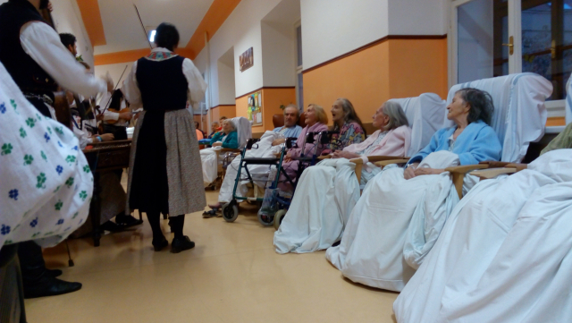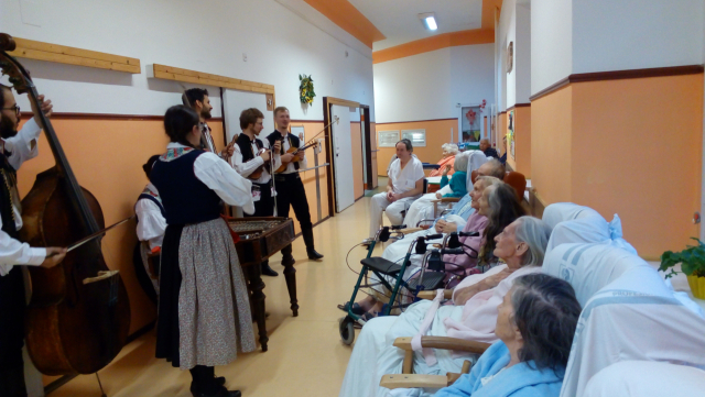 Mladí studenti z folklórního souboru Muzička byli velmi ochotní a vystoupili v dobových krojích, zazpívali známé lidové písně, které rozezpívaly mnohé posluchačky i posluchače. Písničky Aj vy páni muzikanti, My jsme valaši, či Na Pankráci, tam na tom vršíčku jsou uloženy hluboko v paměti většiny seniorů a tak jsme potrénovali nejen hlasivky, ale také paměť, která stále dobře slouží. V při povídání s pacienty jsme se dozvěděli, že jedna z přítomných dam kdysi byla zdatná hráčka na citeru a dokonce jsme mezi posluchačkami objevili také významnou českou operní pěvkyni Libuši Domanínskou, která svého času dobývala hlavní scény v Brně, Praze a také Vídni.