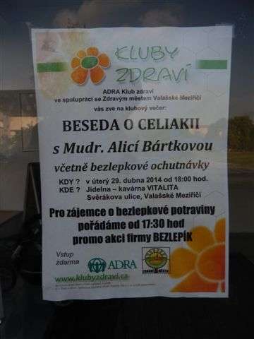 Adraklub zdraví se tentokrát zaměřil na stále se rozšiřující skupinu lidí, kterým nesvědčí pokrmy obsahující lepek. Náčelnice meziříčských celiaků, nezdolná Anežka Hrstková už podruhé na podobnou besedu pozvala odbornici na slovo vzatou, MUDr Alici Bártkovou. Manažerka Vitality, paní Soňa Mročková sem naproti tomu přivábila majitele firmy Bezlepík. Na jedné akci tedy bylo možno jak ochutnat bezlepkové speciality, tak si vyslechnout odborně pojaté odpovědi na nejrůznější, tématu se týkající medicínské otázky. Jak se zdá, bezlepkářům se i v Meziříčí blýská na lepší časy. Firmy Vitalita a Bezlepík se domluvily na vzájemně výhodné spolupráci. Od nynějška už budou zmíněné potraviny k mání i v městě mezi dvěma Bečvami, samozřejmě na základě předchozí objednávky. Teď už nezbývá než si jen přát, aby se bezlepkovým i lepkavým přestala lepit smůla na paty