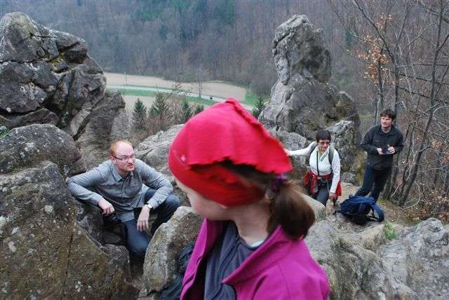Pod vedením nejmladší účastnice se výprava vyšplhá ke skupině skal s názvem Havranka. Z dálky právě zvoní poledne a tak je vyhlášena obědová pauza. Půlhodinový relax završuje nezbytné fotografování. Samozřejmě na hraně bezmála dvacetimetrové kolmé skály.