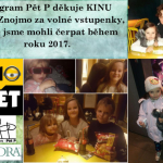 Děti a dobrovolníci z programu Pět P měli opět možnost během roku 2017 využít volných vstupů do kina na filmy a pohádky dle svého výběru. Kino svět nám darovalo zdarma lístky a poukázku do Kavárny Žlutá Ponorka. Dvojice si návštěvu kina vždy velice užily a odnesly si spoustu nových zážitků.