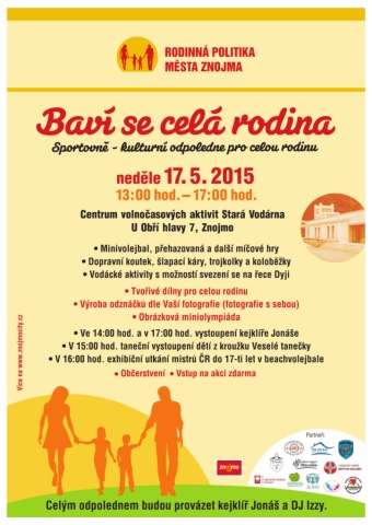 Srdečně vás zveme na sportovně-kulturní odpoledne pro celou rodinu, které pořádá Město Znojmo. Akce pod názvem Baví se celá rodina proběhne v neděli 17. 5. 2015 od 13.00 do 17.00 hod. v Centru volnočasových aktivit Stará vodárna.