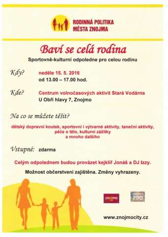 Po roce Vás opět zveme na sportovně-kulturní odpoledne pro celou rodinu, které pořádá Město Znojmo. Akce pod názvem Baví se celá rodina proběhne v neděli 15. 5. 2016 od 13.00 do 17.00 hod. v Centru volnočasových aktivit Stará vodárna.