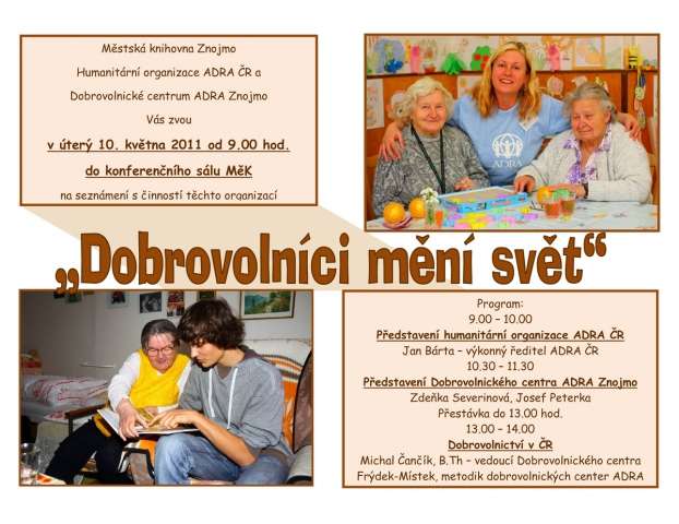 Jelikož chce ADRA dále propagovat myšlenku dobrovolnictví a rozšiřovat řady dobrovolníků na Znojemsku, přidává se k oslavám roku dobrovolnictví a připravuje na úterý 10. května 2011 osvětovou akci na téma „Dobrovolníci mění svět“. Náplní tohoto dne budou přednášky, které bude možné si poslechnout v konferenčním sále Městské knihovny Znojmo na ul. Zámečnické 9.