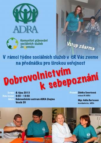 I Dobrovolnické centrum ADRA Znojmo chce předat veřejnosti své zkušenosti z oblasti dobrovolnictví a poskytování pomoci potřebným. Již mnoho přednášek proběhlo na téma, co je to dobrovolnictví, jaká je náplň, co to přináší klientům a celé společnosti, ale rádi bychom teď poukázali na to, co dobrovolnictví přináší samotným dobrovolníkům a jak se může dobrovolnictví odrazit v našem osobnostním rozvoji a poznání.