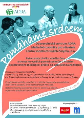 Dobrovolnické centrum ADRA hledá ochotné dobrovolníky, kteří by rádi zpříjemnili život seniorům a osobám se zdravotním postižením v Centru sociálních služeb Znojmo, p.o.