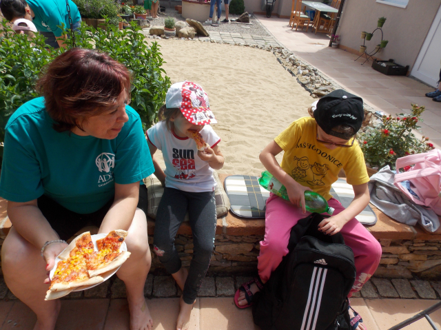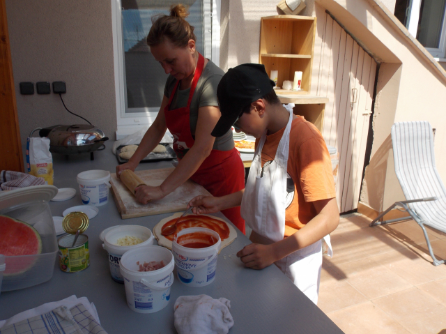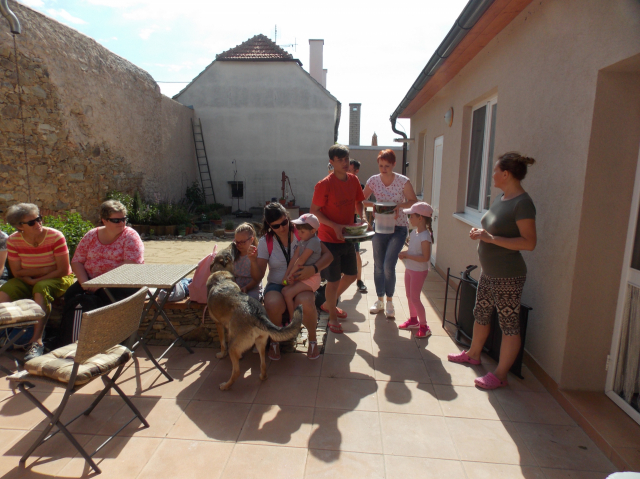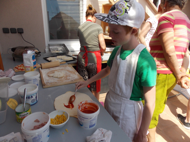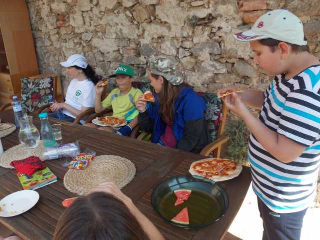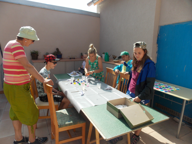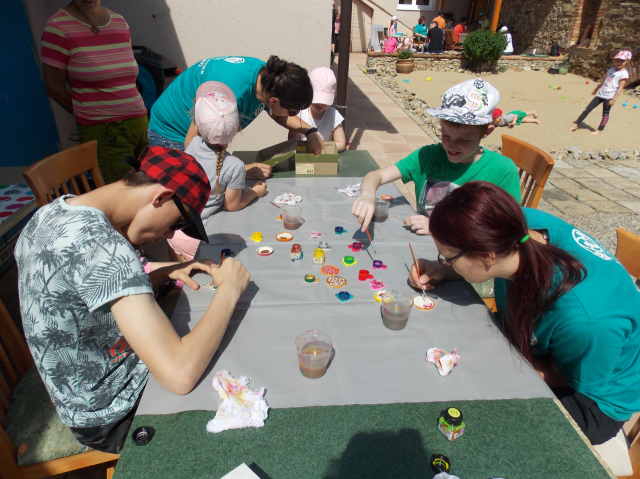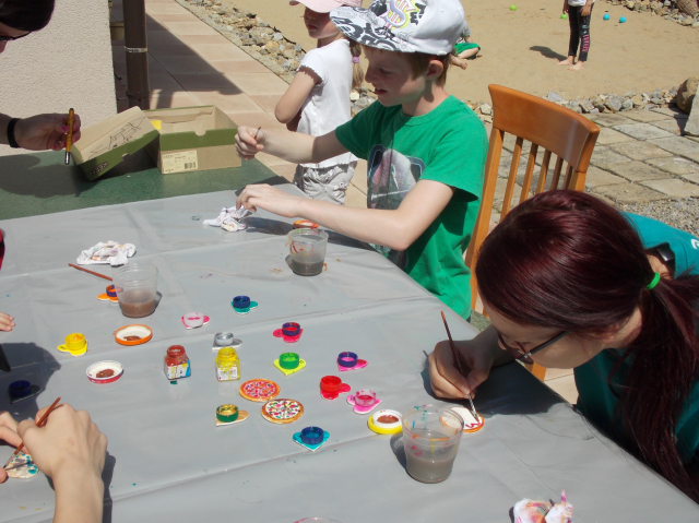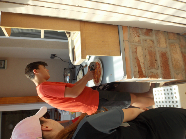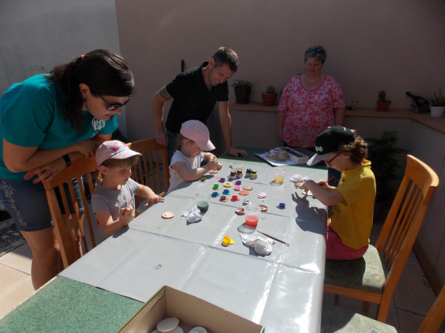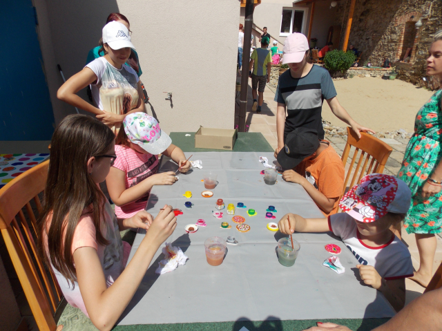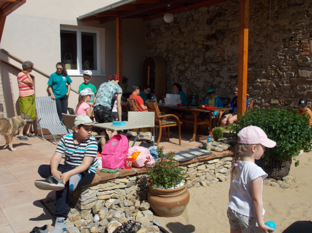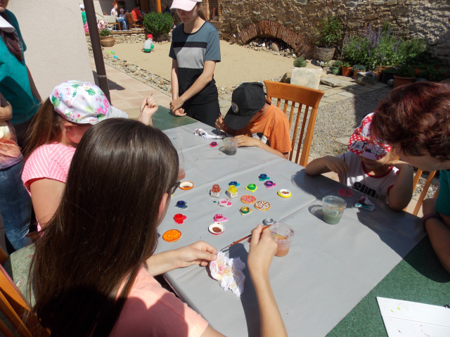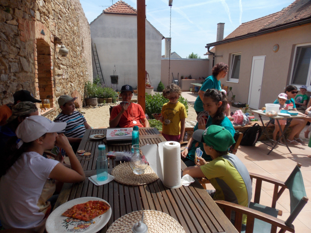 Počasí nám přálo a sluncem zalitý dvorek nám navodil tu pravou atmosféru. Písek se proměnil na hrací hřiště pro petang, v rohu si děti malovaly na keramická kolečka pizza přívěsky a u stolu se hrály karty. Všichni účastníci se postupně střídali a každý si připravil svoji pizzu. Jelikož má dvorek starou kamennou zeď, a je na něm písek, měli jsme pocit, že jsme skutečně v Itálii. Jen moře nám neomývalo chodidla… Děti se dozvěděly, že má Znojmo družbu se dvěma italskými městy a taky proč a kdy tato družba vznikla. Řekli jsme si názvy několika známých italských měst a nějaké zajímavosti, ale teprve nyní si uvědomuji, že jsme si nepustili žádné italské písničky!!! Tak to napravíme příště….