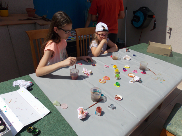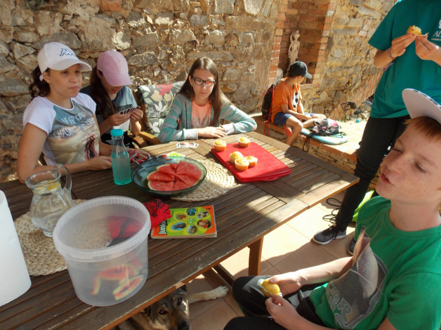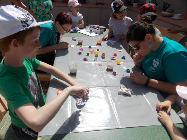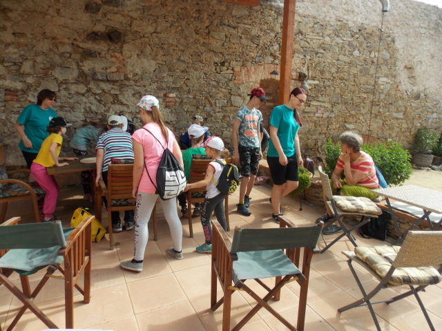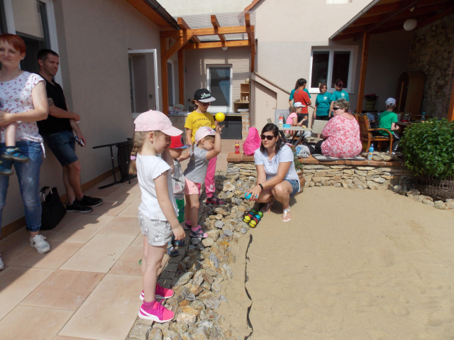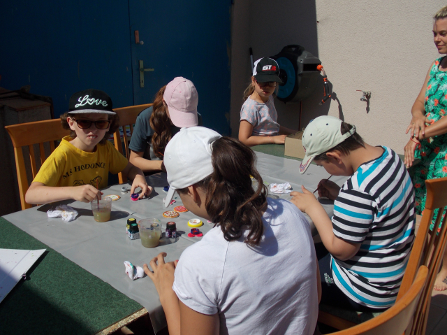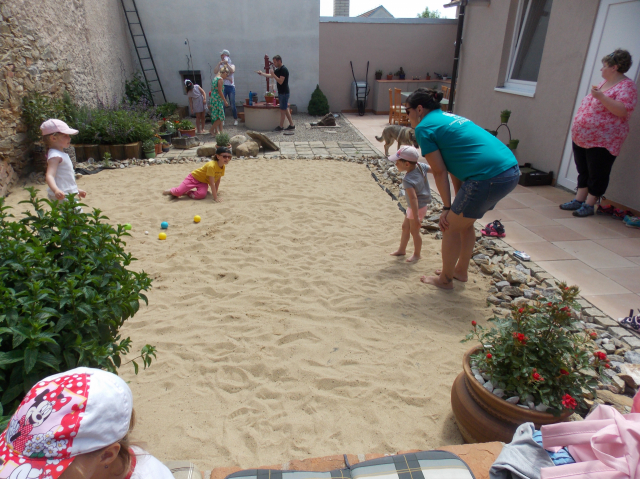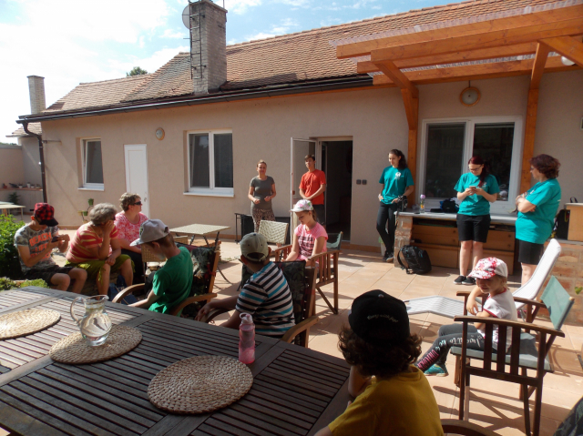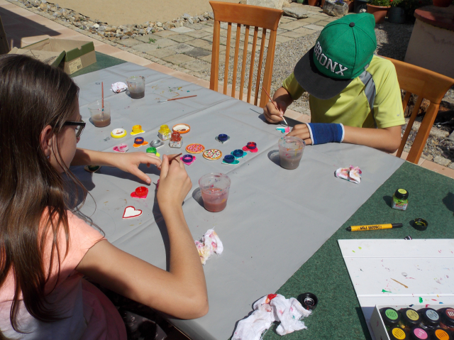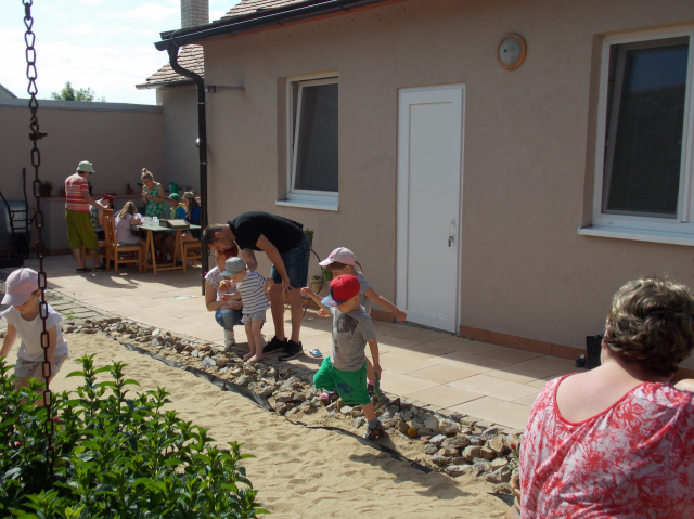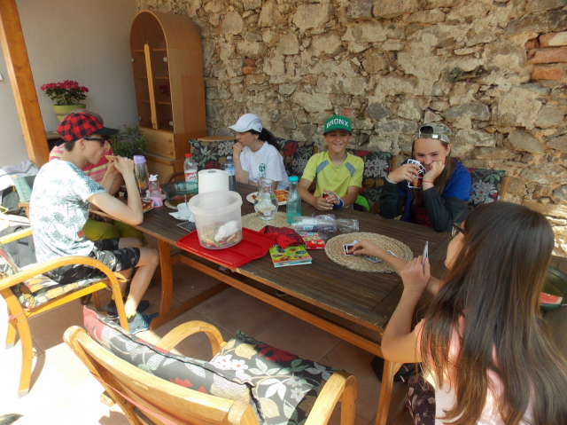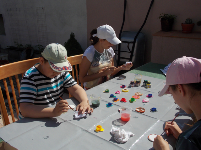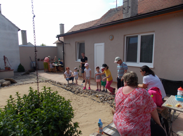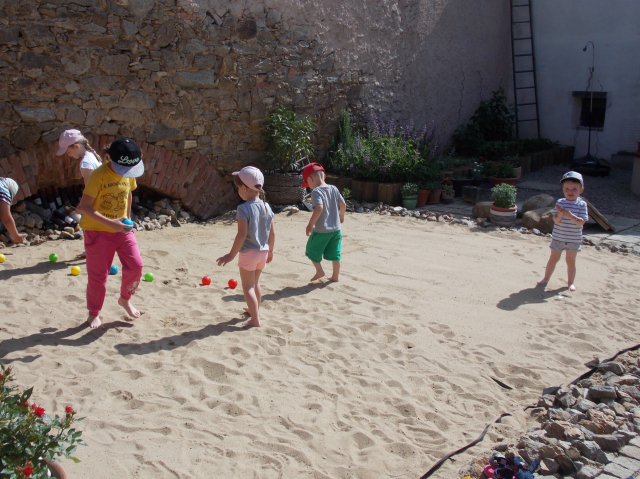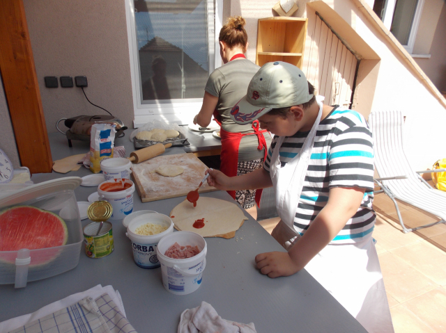 Počasí nám přálo a sluncem zalitý dvorek nám navodil tu pravou atmosféru. Písek se proměnil na hrací hřiště pro petang, v rohu si děti malovaly na keramická kolečka pizza přívěsky a u stolu se hrály karty. Všichni účastníci se postupně střídali a každý si připravil svoji pizzu. Jelikož má dvorek starou kamennou zeď, a je na něm písek, měli jsme pocit, že jsme skutečně v Itálii. Jen moře nám neomývalo chodidla… Děti se dozvěděly, že má Znojmo družbu se dvěma italskými městy a taky proč a kdy tato družba vznikla. Řekli jsme si názvy několika známých italských měst a nějaké zajímavosti, ale teprve nyní si uvědomuji, že jsme si nepustili žádné italské písničky!!! Tak to napravíme příště….