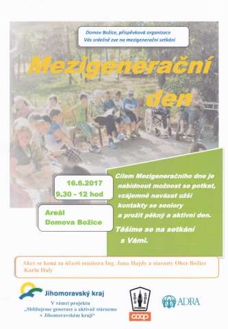 Domov Božice, p.o. Vás srdečně zve na "Mezigenerační den", který proběhne v pátek 16.6. 2017 od 9.30 do 12.00 v areálu zařízení. Dobrovolnické centrum ADRA Znojmo je spolupracující organizací, takže nebude chybět.