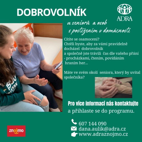 Otevíráme proto nový program pro seniory a osoby s postižením v domácnostech. Pokud víte o někom z vašeho okolí, kdo by tuto službu uvítal nebo chcete pomáhat jako dobrovolník a potřebujete více informací neváhejte nás kontaktovat. Rádi poskytneme potřebné informace: dana.aulik@adra.cz, tel:607 144 090