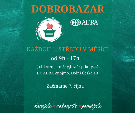 Každou 1. středu v měsíci, od 9h - 17h, si můžete u nás výhodně nakoupit. Přispějete tím na provoz Dobrovolnického centra ve Znojmě a nového Programu pro seniory a osoby s postižením v domácnostech, který se právě rozjíždí. Budeme také rádi za darování oblečení (dámského, dívčího, dětského) které je v perfektním stavu a i vy byste si ho koupili. Uvítáme funkční nepoškozené hračky, knížky a jiné zboží v malém množství. Více informací: dana.aulik@adra.cz