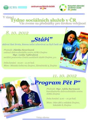 Ve dnech 8.–14.října 2012 proběhnou v rámci Týdne sociálních služeb odborné přednášky na různá témata v oblasti sociální problematiky. I Dobrovolnické centrum ADRA dostane prostor pro prezentaci.