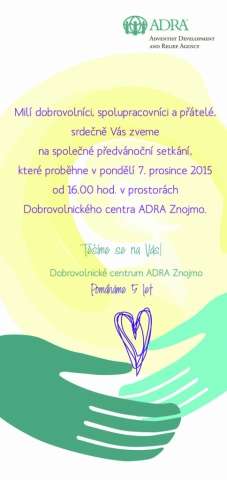V pondělí 7.12. proběhne předvánoční setkání dobrovolníků, spolupracovníků a přátel znojemské ADRY. Hlavní program bude od 16.00 hod. v prostorách dobrovolnického centra na Veselé 20.