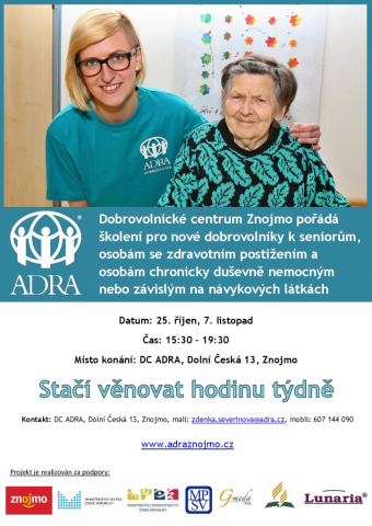 Úvodní školení proběhnou 25. října a 7. listopadu vždy od 15.30 hod. – 19.30 hod. v Dobrovolnickém centru ADRA Znojmo na Dolní České 13.