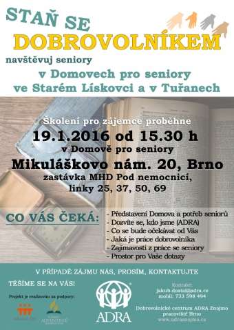 Srdečně Vás zveme na úvodní seminář pro zájemce o dobrovolnictví v Domovech pro seniory na Mikuláškově náměstí ve Starém Lískovci a v Tuřanech na ulici Zapletalova.