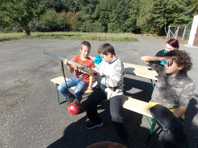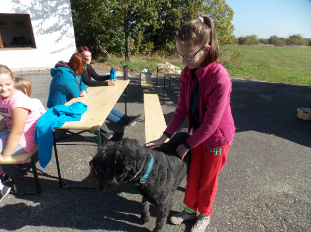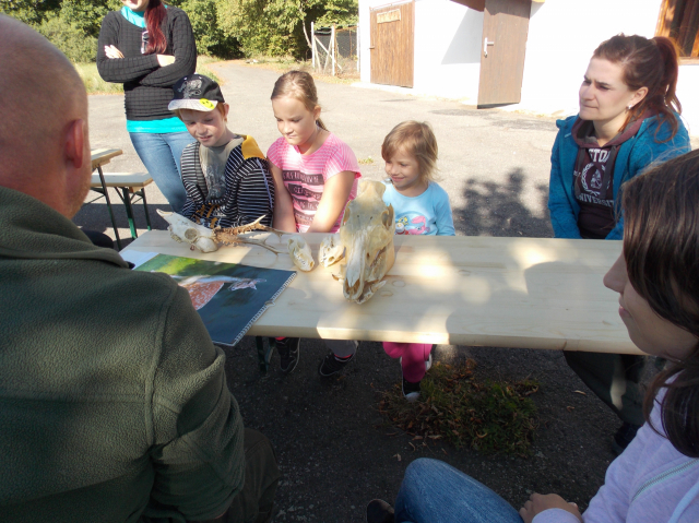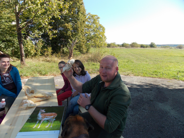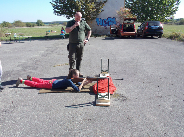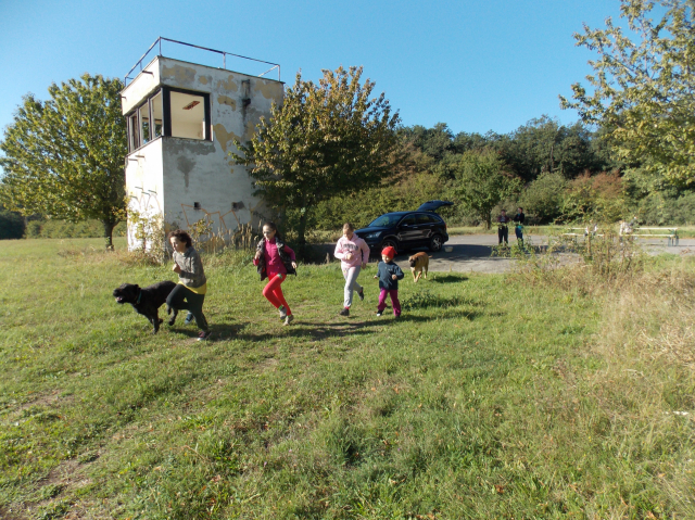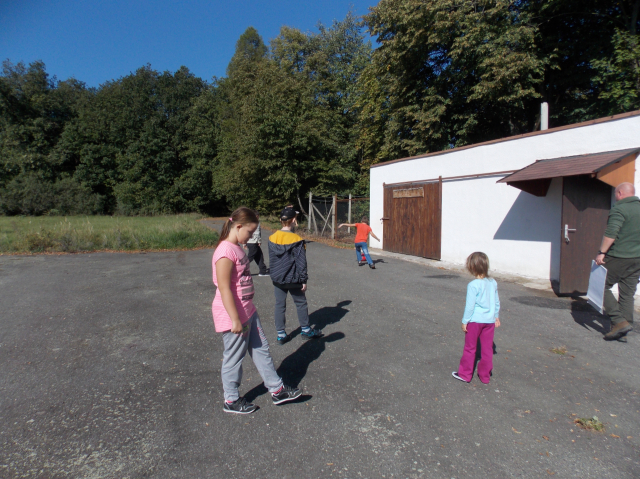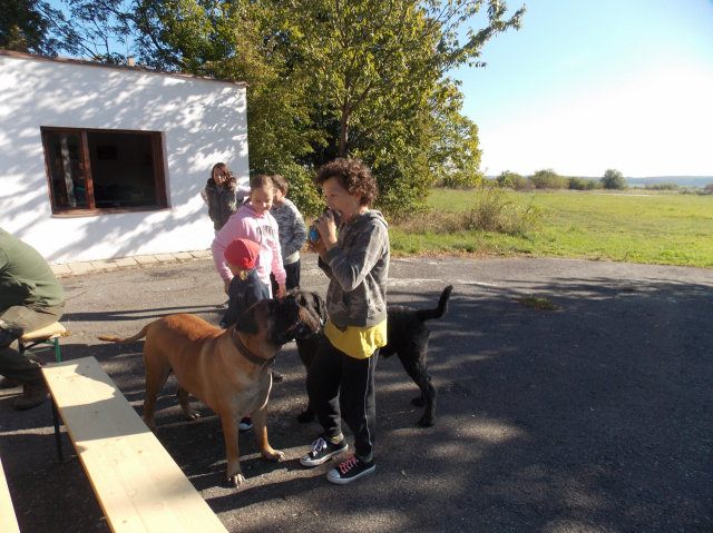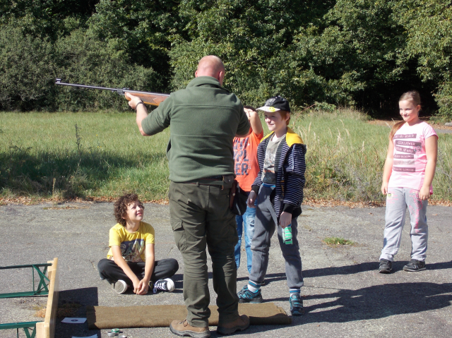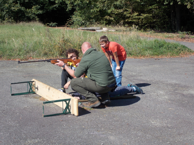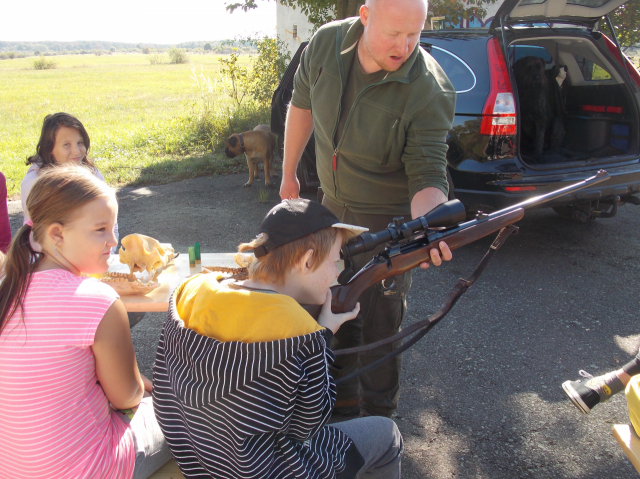 Pejsci se rozehřáli hrou na schovávanou a děti zase bežeckými závody. Společně jsme si pak osvěžili znalosti z myslivosti, lovectví a určování psích plemen. Děti dle obrázků určovaly druhy divoké zvěře a nakonec si vyzkoušely přesnou mušku střelbou na terč. Neposlední fyzickou aktivitou byla kopaná, aportování a schovávání kořisti, kterou Bárt vždy úspěšně vyčmuchal.