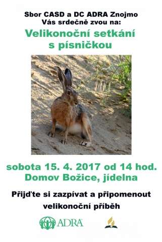 Církev adventistů sedmého dne a Dobrovolnické centrum ADRA Znojmo Vás srdečně zvou na "Velikonoční setkání s písničkou", které proběhne 15.4. od 14.00 hod. v Domově Božice, p.o.