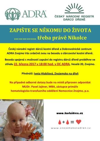 Český národní registr dárců kostní dřeně a Dobrovolnické centrum ADRA Znojmo srdečně zvou na besedu o dárcovství kostní dřeně. Beseda spojená s možností zapsání do registru dárců dřeně proběhne ve středu 22. března 2017 v 18.00 hod. v DC ADRA, Veselá 20, Znojmo.