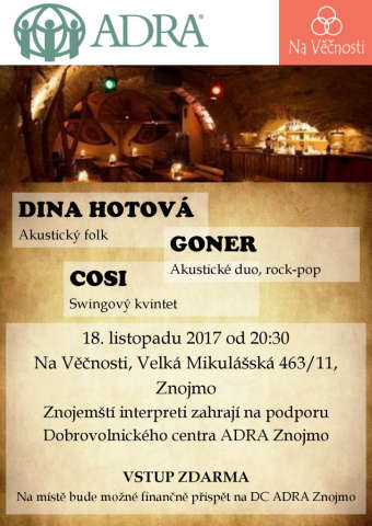 V sobotu 18. listopadu od 20:30 proběhne v Domě Na Věčnosti koncert na podporu Dobrovolnického centra ADRA Znojmo. V průběhu večera vystoupí Dina Hotová, GONER a COSI.