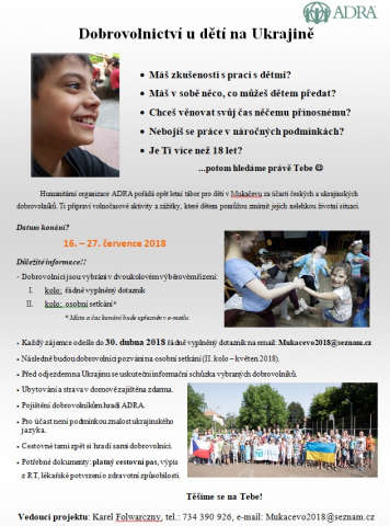Dobrovolníci z ČR a z Ukrajiny (studující na Mukačevské státní univerzitě) se dětem budou věnovat po celý den a připravovat jim zajímavý program. Stejně jako v předchozích letech se bude jednat o sportovní aktivity, o výtvarné a tvořivé práce, také taneční činnost a jiné. Za tímto účelem pořádáme v Mukačevu seminář pro zájemce o dobrovolnictví v ukrajinských podmínkách, který se bude konat ve dnech 19. - 20. 5. 2018. Seminář povedou lektoři z organizace ADRA v ČR.
