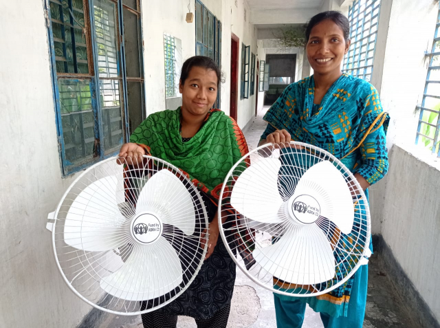 - Teploty v Bangladéši v teplejších měsících běžně stoupají na 34 °C i více. Horko a vlhké podnebí je náročné snést. Ve dne ztěžuje dětem výuku, v noci spánek. Proto jsme ve třídách a na pokojích internátních škol instalovali 100 nových větráků. Zajistí proudění vzduchu a mírné ochlazení. Přes den se děti budou moci v bangladéšském horku lépe soustředit na výuku a v noci se jim bude lépe spát.