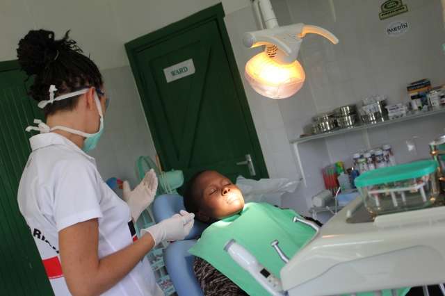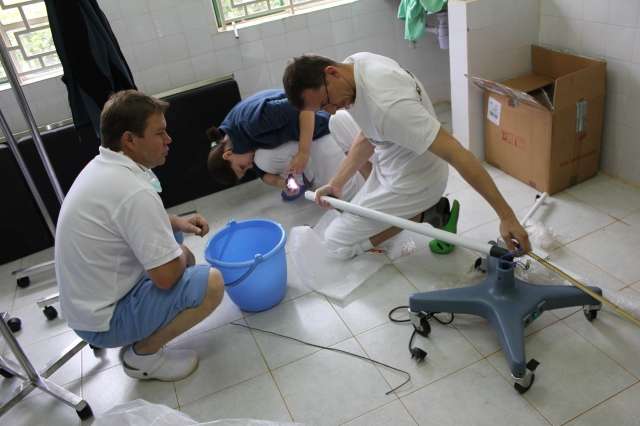 Do nemocnice jsme dorazili po rozbahněných cestách až v pozdních hodinách, tak jsme si jen vybalili a šli spát. Ráno jsme se seznámili s areálem střediska, místním personálem a dali se do práce. Zubaři pracovali ve svojí ambulanci a my ostatní jsme se rozdělili na interní a chirurgickou ambulanci, na porodní sálek a do laboratoře. Zkrátka kde bylo zrovna potřeba. Na ambulanci s námi vždy byl jeden z místních pracovníků, který nám dělal překladatele, zapisovatelku a sestřičku v jedné osobě. V laboratoři byl místní laborant.