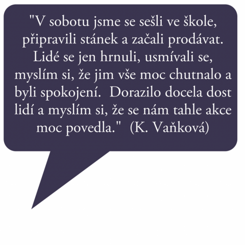 Byli jsme svědky, že i tentokrát se spolupráce s dalšími aktéry ve městě vyplatila – paní starostka u sousedního stolu prodávala fairtradové výrobky obchůdku Jeden svět, pan farář místní Českobratrské církve evangelické vyhlašoval program a zároveň pozval trubače Consonare, kteří zahájili prodej fairtradové kavárny krátkým koncertem. Díky tomu mezi účastníky celé akce nechyběli ani náhodní kolemjdoucí, kteří mohli nasát kouzlo domácí atmosféry. Více si můžete přečíst na stránkách školy, fotografie si můžete projít v galerii níže.