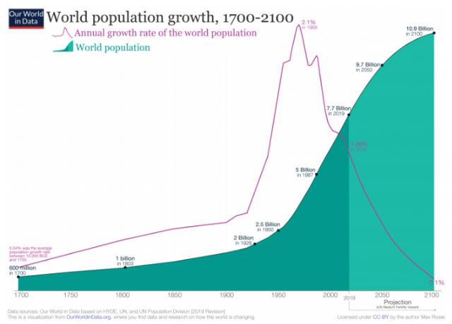 Za posledních 100 let se populace na Zemi zčtyřnásobila. V roce 2012 dosáhl počet lidí na Zemi 7 miliard, přičemž tento rok završil období nejrychlejšího přírůstku - mezi lety 1975 a 2011 přibyly v absolutních číslech tři miliardy lidí. To znamená miliardu každých 12 let. Od té doby sledujeme zpomalení přírůstku, a podle odborníků bude tento sestupný trend nadále pokračovat. Podrobněji se touto statistikou zabývá následující graf.