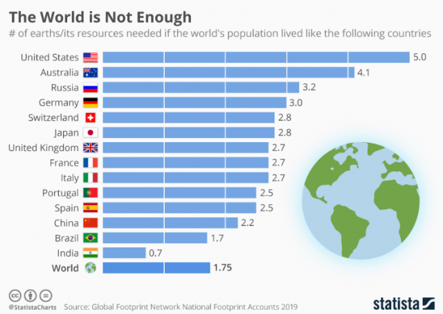 Nejvíce planetárních zdrojů využívají lidé v rozvinutých zemích světa. Elektřina, doprava či nejnovější technologie vyžadují obrovské množství zdrojů (spalování fosilních paliv, těžba kovů), díky nimž si (alespoň prozatím) ty nejvyspělejší státy udržují vysoký životní standard. Ten ale není dostupný všem. V méně rozvinutých zemích lidé nemají přístup k věcem, které nám připadají naprosto samozřejmé. Z pohledu udržitelného chování si ale tyto země vedou daleko lépe. V následující grafice se můžete podívat, kolik planet bychom potřebovali, kdyby všichni spotřebovávali zdroje tak, jako uvedené státy. Více zajímavých údajů (například co to je tzv. World Overshoot Day) najdete zde.