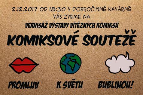 Srdečně Vás zveme na vernisáž výstavy vítězných komiksů, která se bude konat 2.12. od 18:30 v Dobročinné kavárně Cesta domů, neziskové organizaci podporující domácí hospic (Soukenická 1193/15, Praha 1, poblíž stanice metra B, Nádraží republiky a tramvajové zastávky Bílá labuť.). Událost naleznete i na Facebooku pod tímto odkazem.