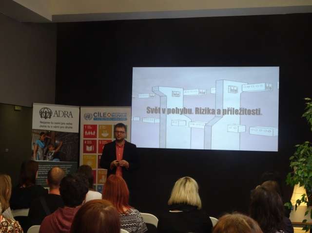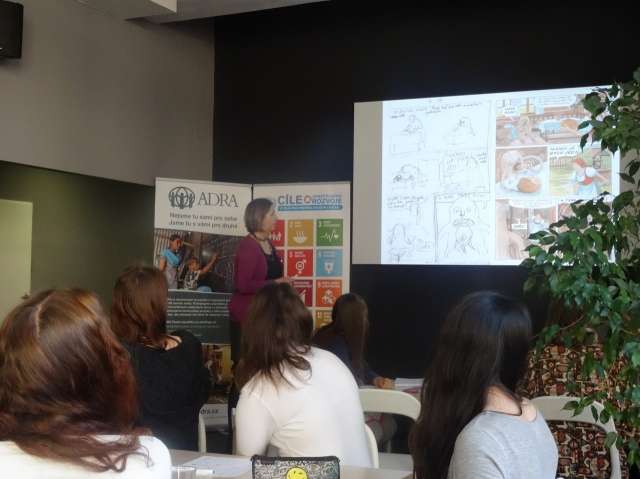 Následně vedoucí oddělení vzdělávání Kristýna Nnaji krátce představila činnost ADRY a zejména projektu Opravdový svět. Ten se zaměřuje na globální rozvojové vzdělávání na školách, informování studujících i vyučujících o globálních problémech a také pořádá komiksovou soutěž, která s těmito tématy úzce souvisí.