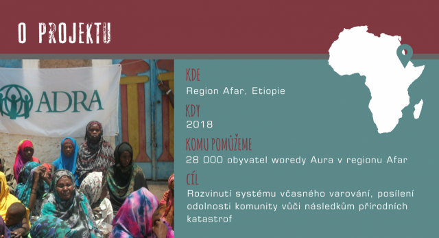 V současné době se k obyvatelům odlehlejších etiopských okrsků téměř nedostávají aktuální informace týkající se vývoje počasí. Ve spolupráci s ADRA Ethiopia bude proto vytvořen systém včasného varování, díky kterému bude mít přibližně 28 000 obyvatel, jejichž obživa závisí na počasí, lepší přístup k informacím o blížících se suchách a deštích. Budou na danou situaci tedy moci lépe reagovat a v případě hrozícího sucha či povodní dobytek například prodat na trhu, tak aby jim stádo neuhynulo.